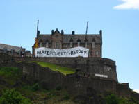 Only then did I notice that the far western end of Princes Street was blocked by police vehicles across all six lanes. I walked in that direction and realised that what I had seen was a very slow-moving march proceeding eastwards. Three police vans led the procession and the group of a few hundred marchers was completely surrounded by police officers - mainly from London. After around thirty minutes they reached the junction with the Mound. By this time several mounted police were lined up in Hanover Street and shortly afterwards a large steel barrier was erected across the road. This prevented more people from getting into Princes Street, but "normal" folk were being let out. I walked down Rose Street and re-entered Princes Street further west. It was possible to walk back towards the demonstration where several people had been arrested and were being processed and put into police vans. When I left, the demonstrators were surrounded by a ring of nose to tail police vans with some mounted police manoeuvring inside the "corral".